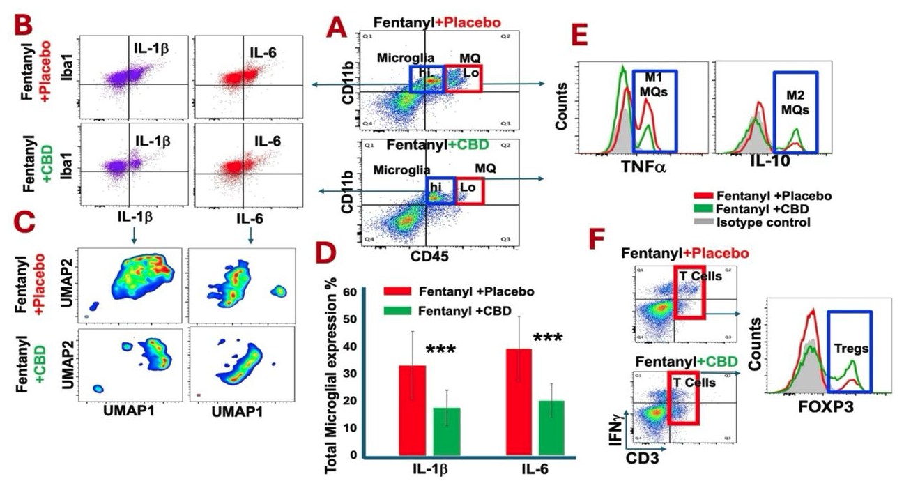 An assessment of neuroinflammatory signals including microglia, infiltrating macrophages and T lymphocytes was performed using flow cytometry analysis: A) CBD inhalation could enhance counter inflammatory functions of both microglia (CD45loCD11b+Iba1+) and infiltrating macrophages (CD45hiCD11b+ IL-10+) with higher level of IL-10 expression compared to placebo treated group. B) CBD inhalation reduced expression of pro-inflammatory cytokines, IL-1b and IL-6, by microglia compared to placebo group. C) The analysis of flow cytometry data using the FlowJo software plugin for the algorithm UMAP. The UMAP subtraction analysis revealed numerous spatial clusters with significant differences in IL-1b and IL-6 distribution between fentanyl addicted mice treated with placebo versus CBD treated mice. D) The chart with bargraphs demonstrates the quantified measures for IL-1b and IL-6 expression by microglia with significant reduction in CBD treated compared to placebo group (***p<0.01). E) CBD treatment reduced the type 1 infiltration macrophages (CD45hiCD11b+ TNFa+) while enhanced the type 2 with higher expression of anti-inflammatory IL-10 cytokine. F) CBD inhalation increased the frequency of regulatory T cells (Tregs: CD3+FOXP3+IL-10+IFNg-/lo) with higher expression of IL-10, promoting anti-inflammatory signals.