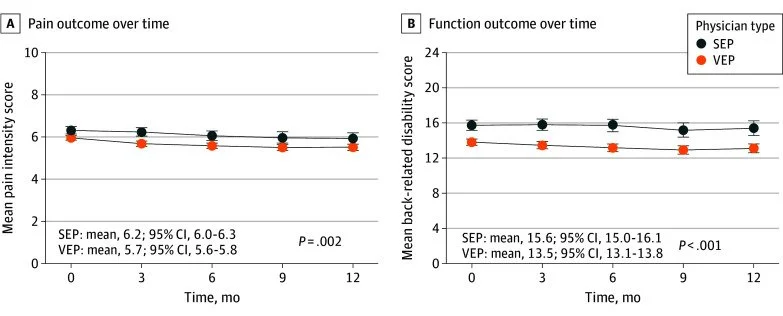 Back-Related Disability: Similar trends were observed for back-related disability, where patients treated by more empathic physicians reported lower disability scores (14.9 vs 16.8 on the Roland-Morris Disability Questionnaire, p < .001), indicating better functional outcomes.