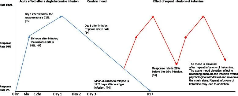 The graph provided in the study of response rates (to my knowledge) is measuring strictly ketamine, without coaching or therapy - I believe that ketamine is not a quick-fix; it is simply a tool to be utilized in the process of “reprogramming” our highly neuroplastic minds. While the window of high opportunity for change is relatively narrow (approximately 24 hours), if proper integration practices are implemented, the outcomes can be truly life-changing, and at the very least, life-improving.
